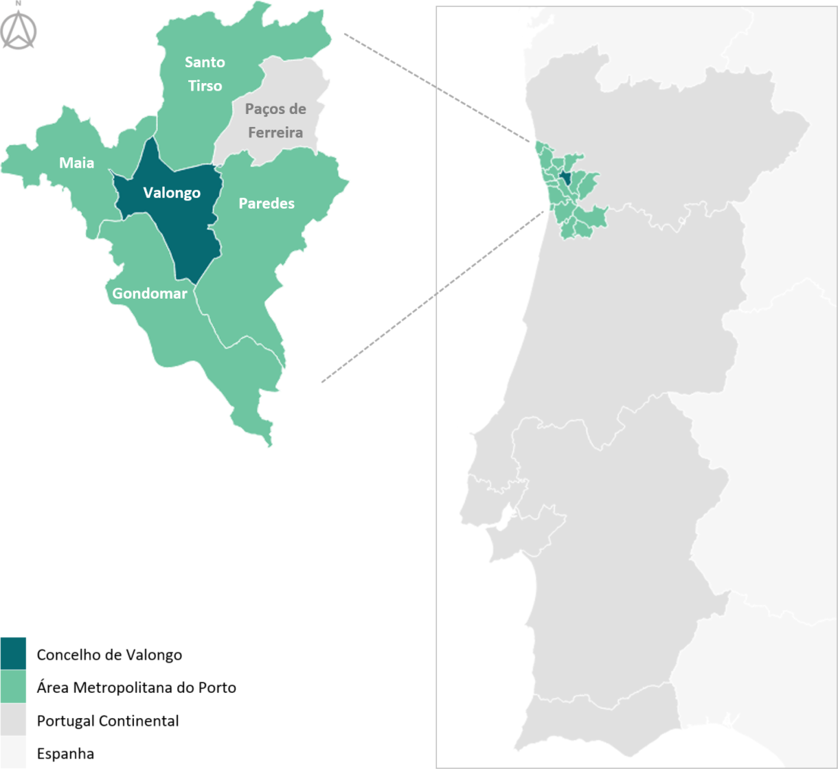 Valongo localiza-se na Região do Norte, integra a Área Metropolitana do Porto (AMP) e apresenta uma área territorial de 75,12 km2. Os limites geográficos do concelho compreendem a Norte, o concelho de Santo Tirso, a Nordeste, o concelho de Paços de Ferreira, a Este, o concelho de Paredes, a Sudoeste, o concelho de Gondomar, e a Oeste, o concelho da Maia.