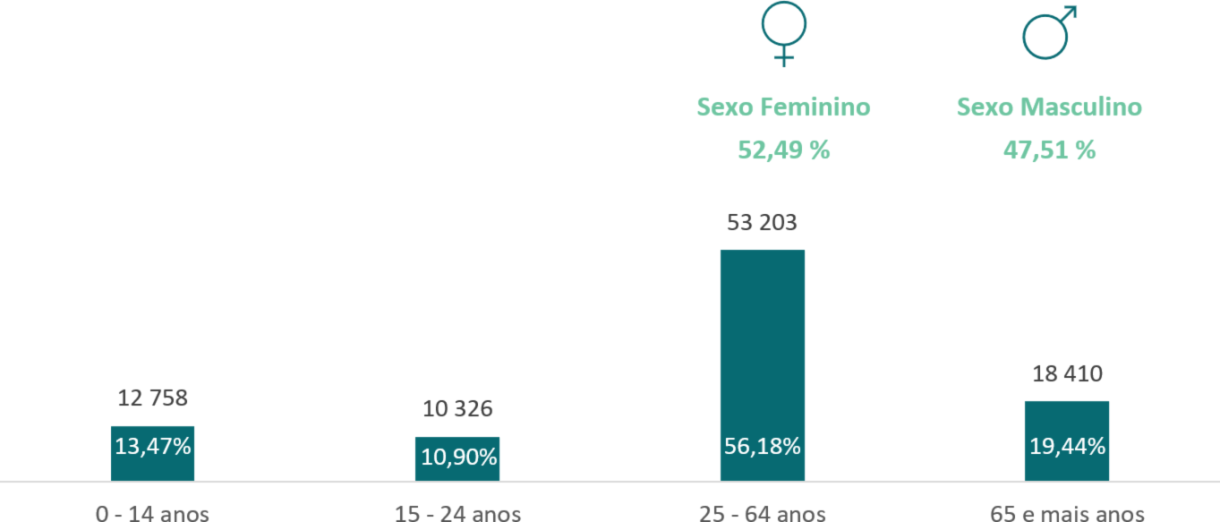 Relativamente à distribuição da população residente por faixa etária, o intervalo dos 25 aos 64 anos (56,18%) é a classe etária mais representada. Seguiam-se as pessoas com 65 e mais anos (19,44%), a população mais nova, com idades compreendidas entre 0 e 14 anos (13,47%) e, por fim, as pessoas com idades compreendidas entre os 15 e os 24 anos (10,90%).