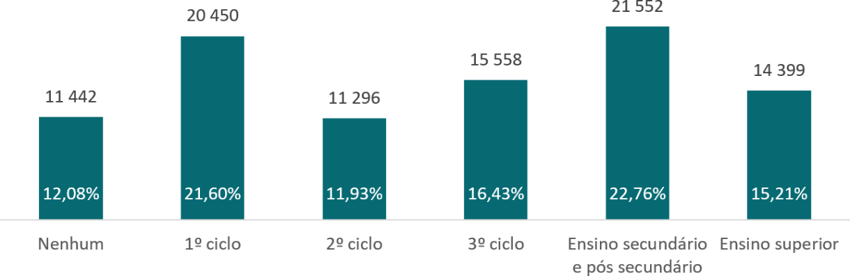 Na qualificação da população, e de acordo com os Censos 2021, é possível aferir que 33,68% da população não possuía nenhum nível de escolaridade ou apenas possuía o 1.º Ciclo do Ensino Básico (31.892 pessoas), 28,36% possuía o 2º ou 3º Ciclo do Ensino Básico (26.854 pessoas), 22,76% possuía o Ensino Secundário e Pós-Secundário (21.552 pessoas) e 15,21% o Ensino Superior (14.399 pessoas).